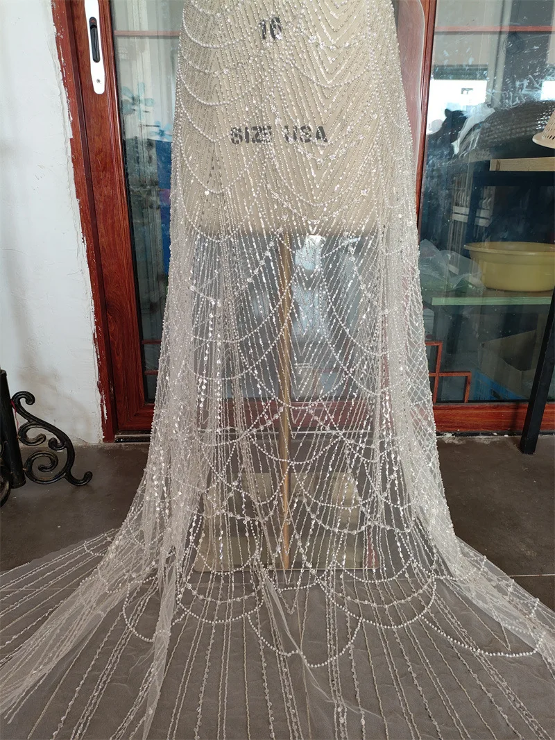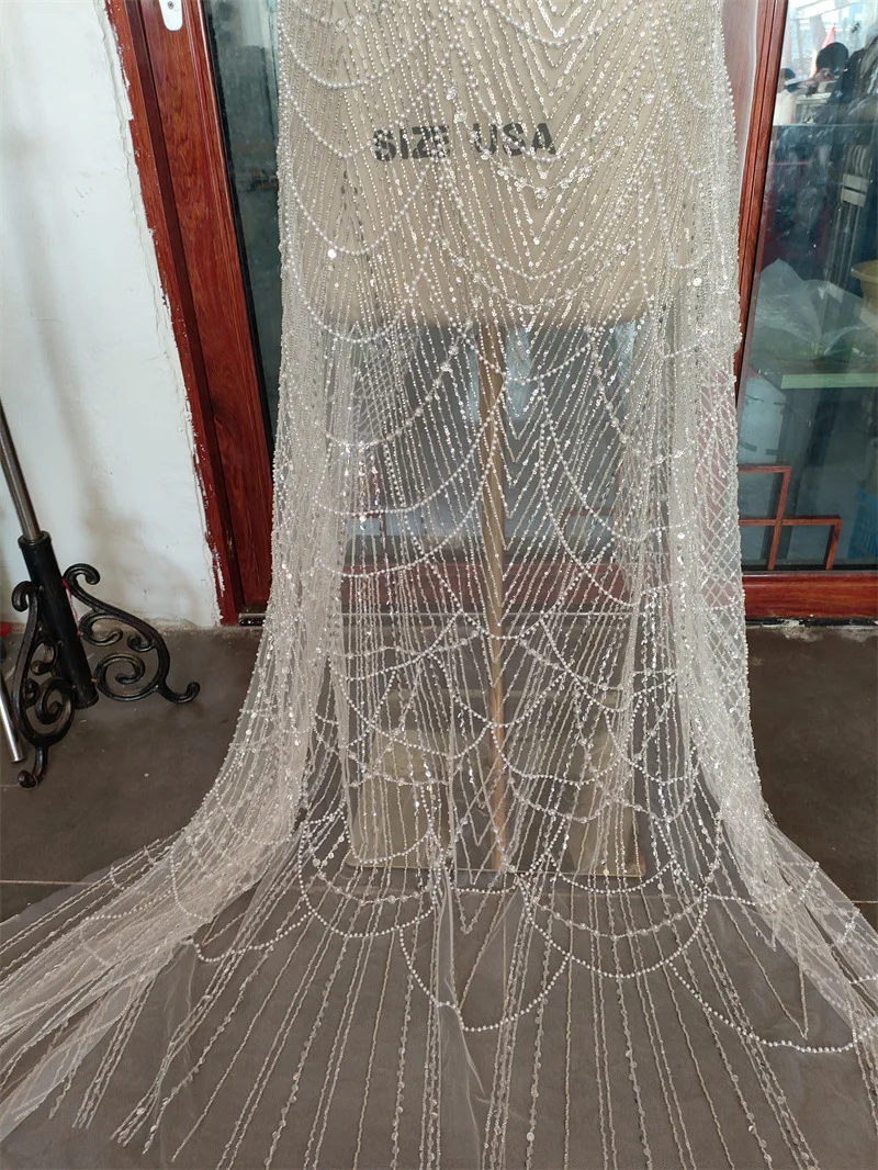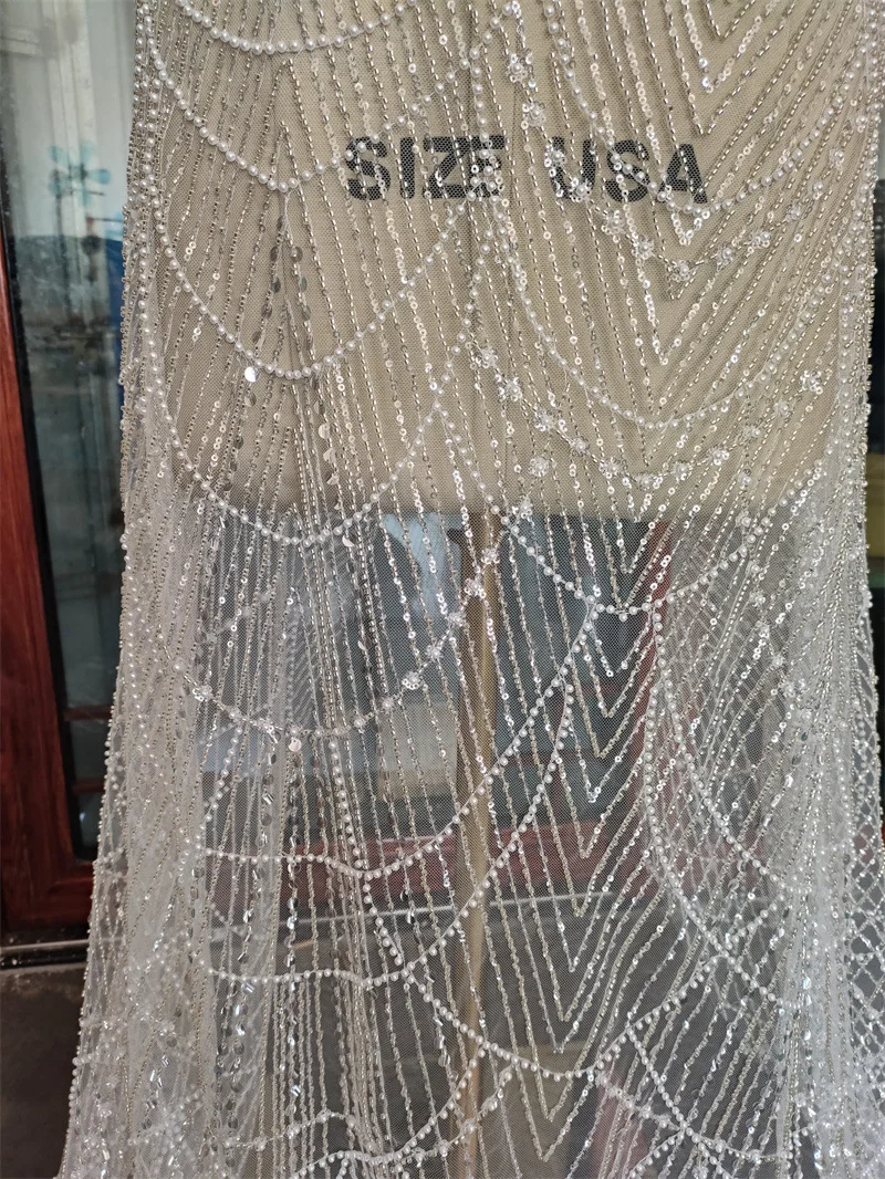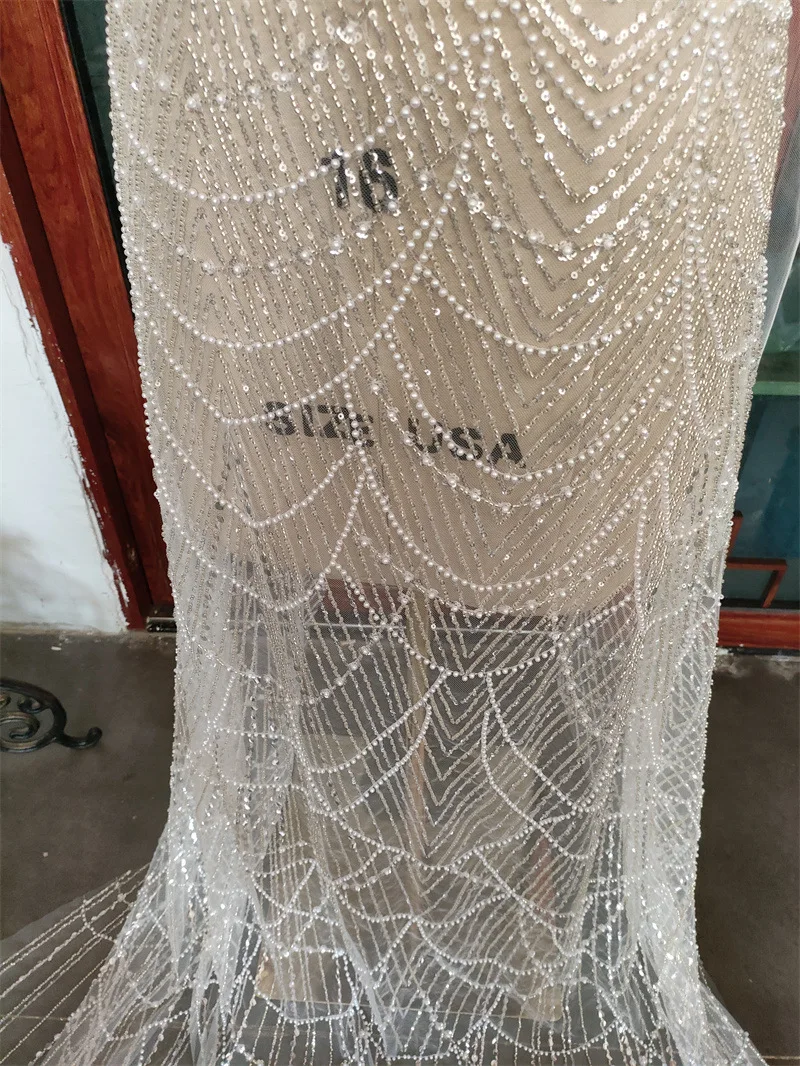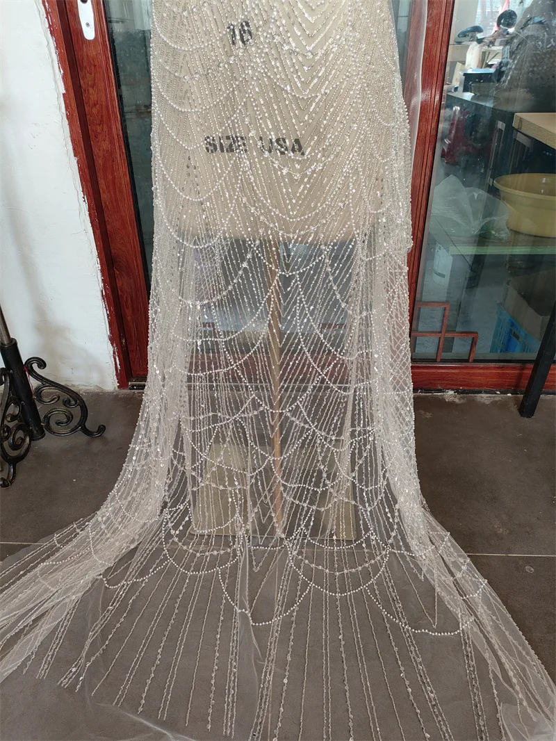 فستان زفاف رائع من اللؤلؤ الأبيض من قماش الدانتيل المجوف من اللؤلؤ المطرز بالخرز والأظافر وتصميم الملابس وإكسسوارات الدانتيل