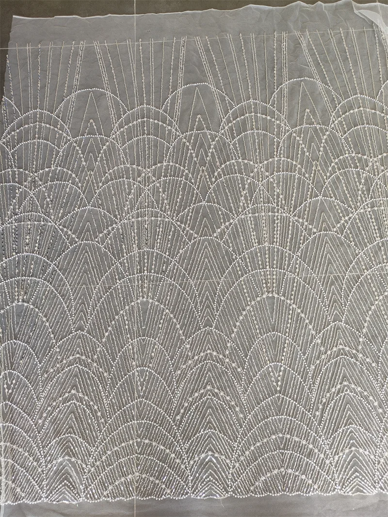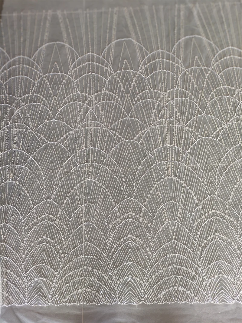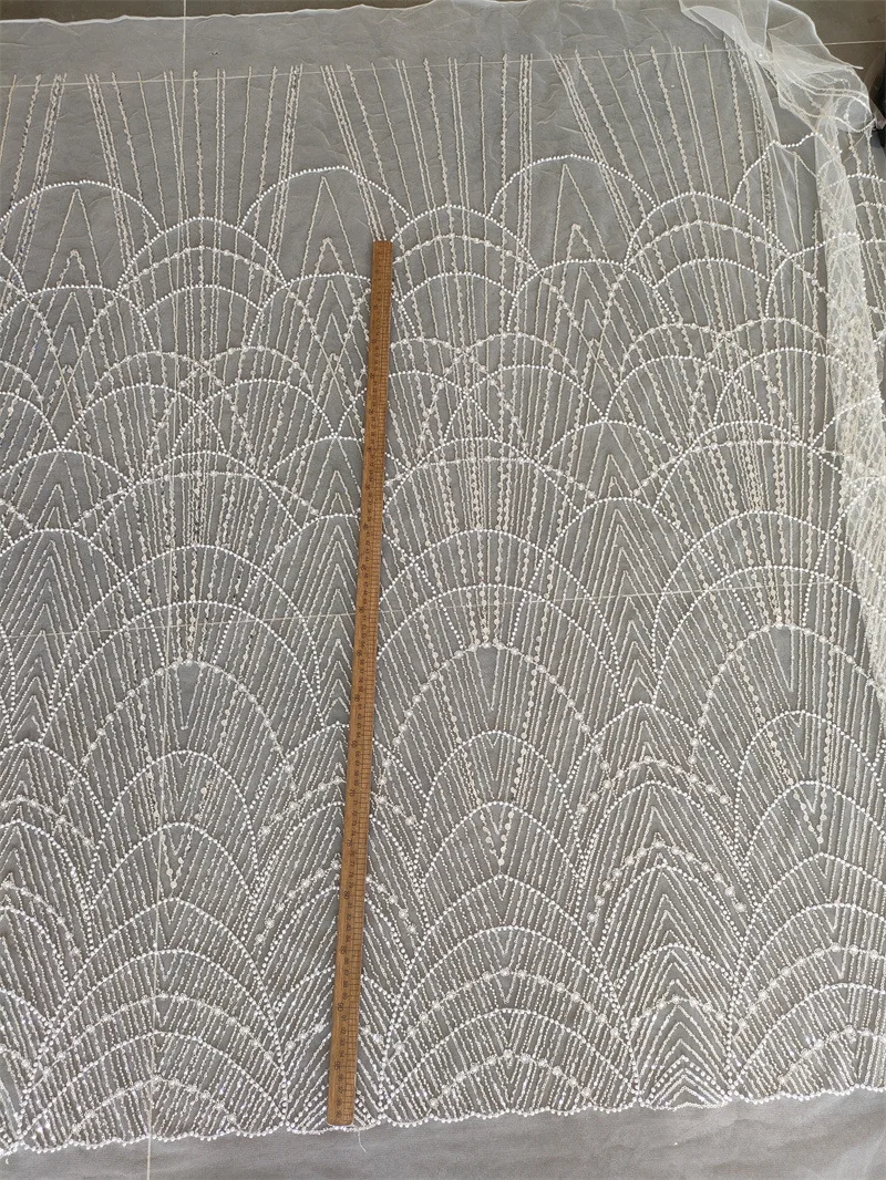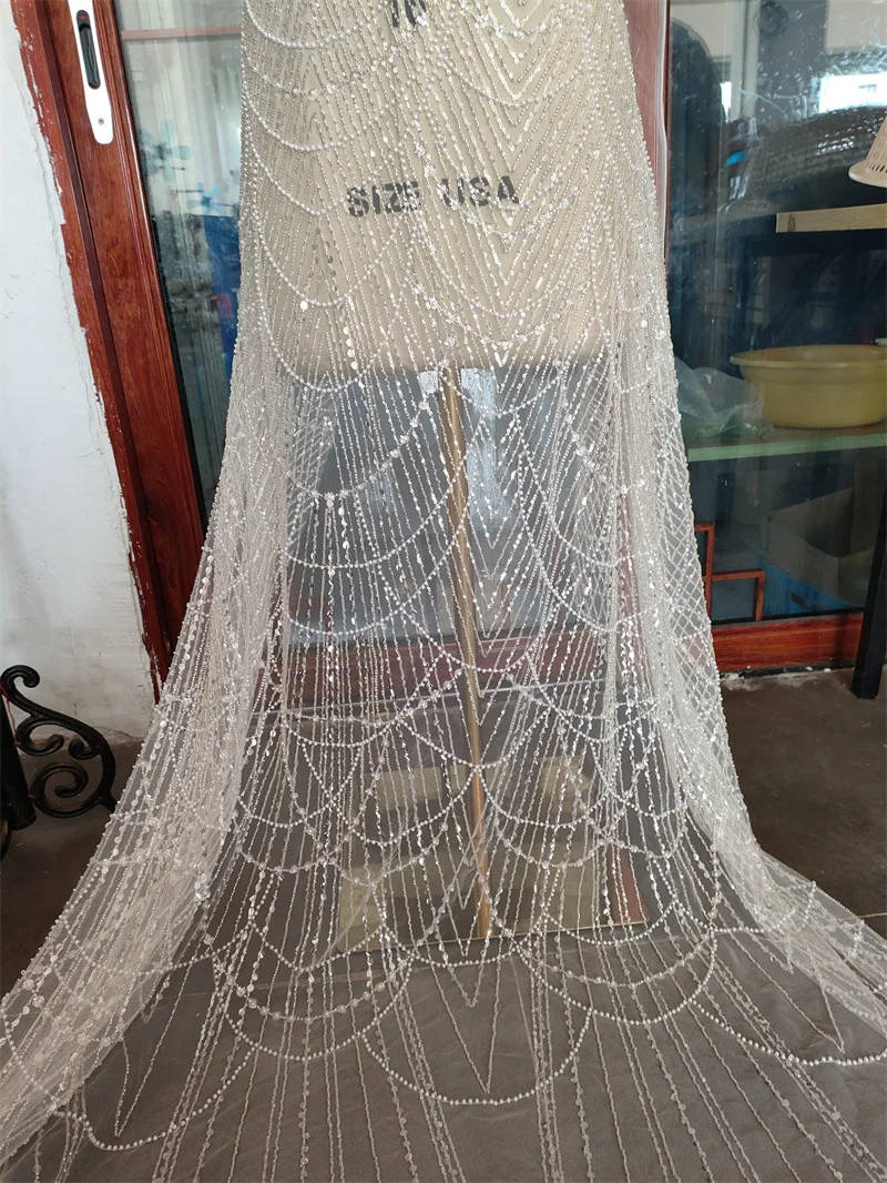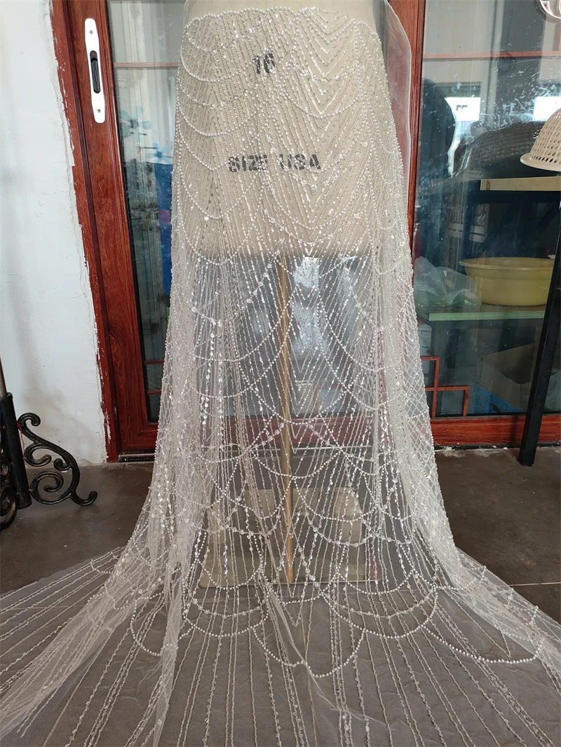 فستان زفاف رائع من اللؤلؤ الأبيض من قماش الدانتيل المجوف من اللؤلؤ المطرز بالخرز والأظافر وتصميم الملابس وإكسسوارات الدانتيل