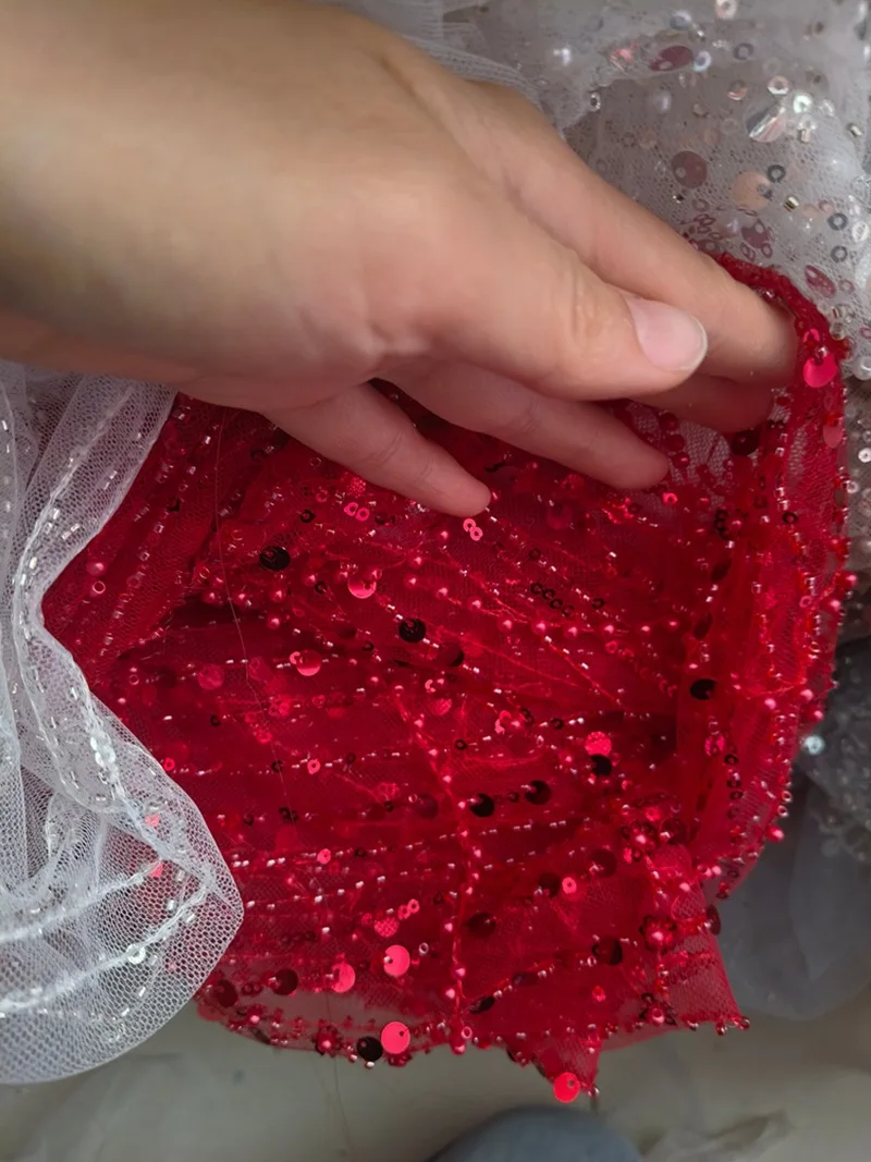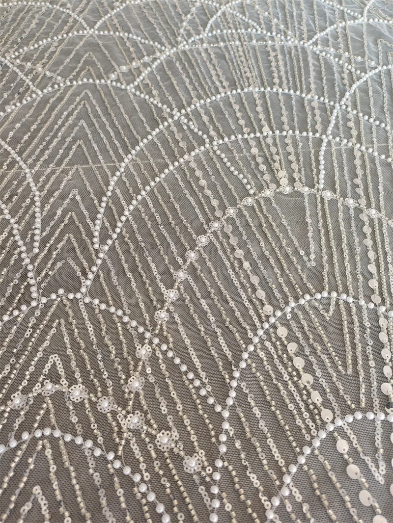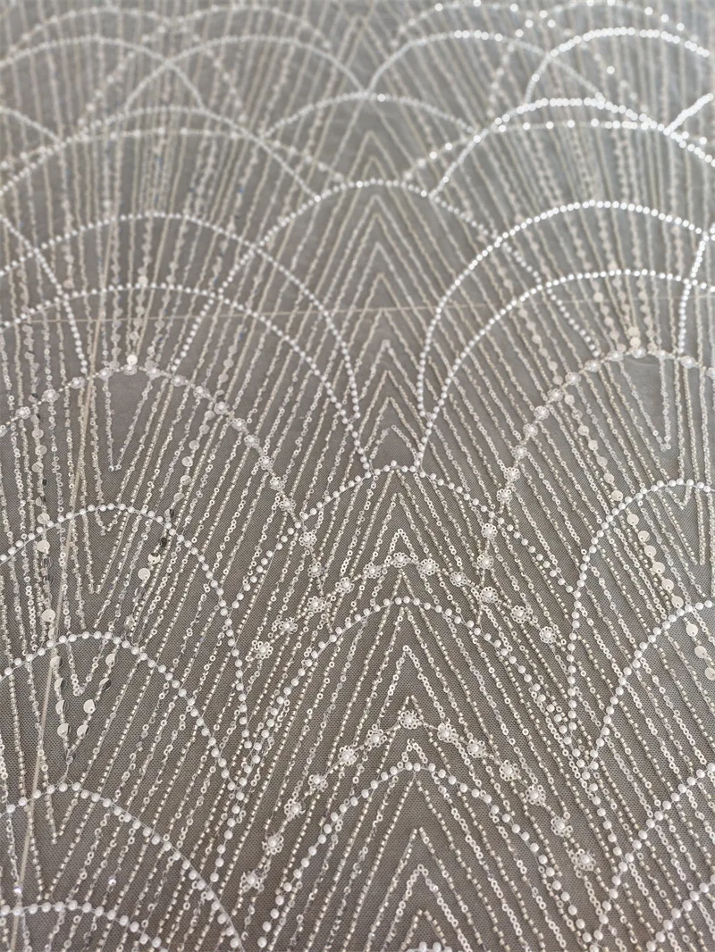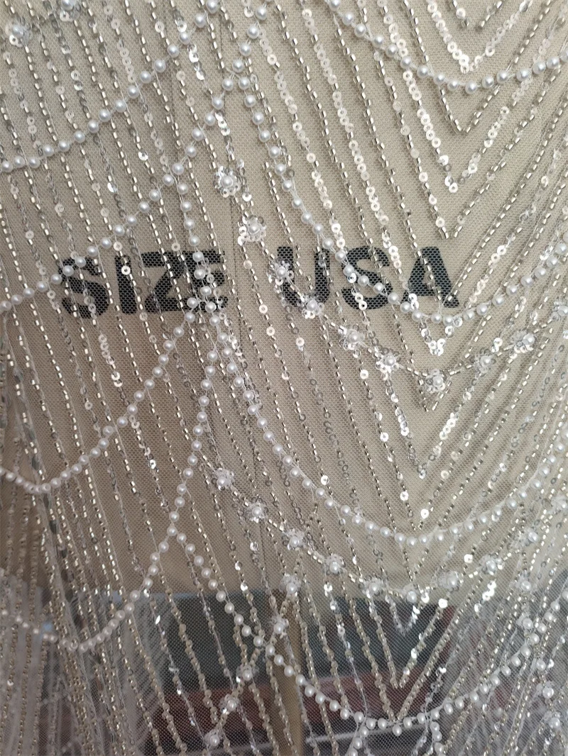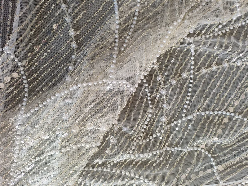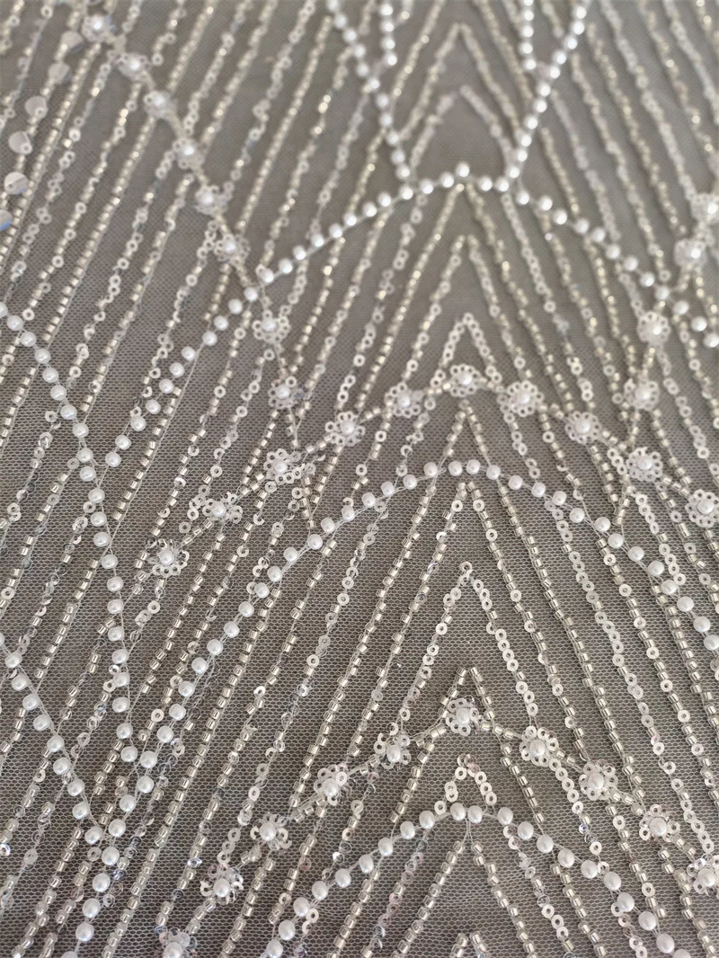 فستان زفاف رائع من اللؤلؤ الأبيض من قماش الدانتيل المجوف من اللؤلؤ المطرز بالخرز والأظافر وتصميم الملابس وإكسسوارات الدانتيل