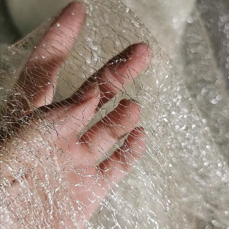 تصميم فريد: يتميز بأنماط دانتيل ذهبية وفضية غير منتظمة على قاعدة شبكية دقيقة، مما يضيف لمعانًا فاخرًا وملمسًا فنيًا إلى أي إبداع.