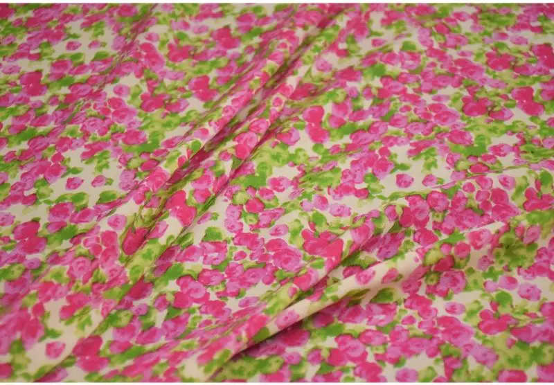 قماش شيفون مزدوج الكريب مزين بنقوش زهرية صغيرة باللونين الوردي والأخضر - مناسب لفصلي الربيع والصيف، طوله 148 سم