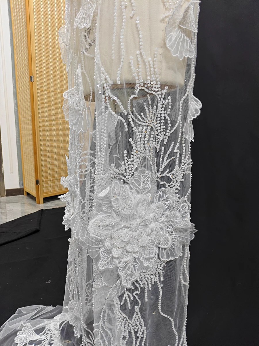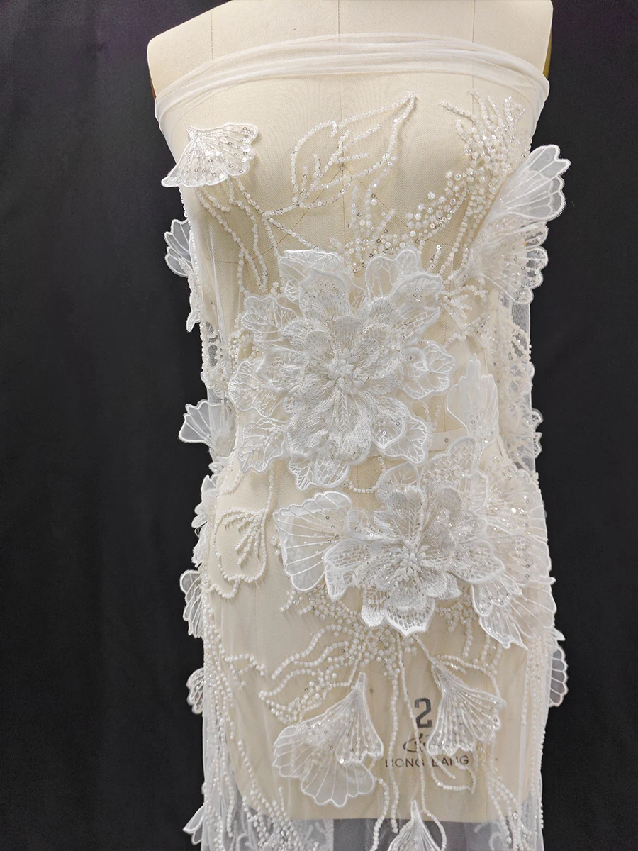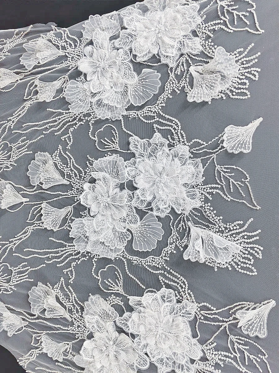 Bordado de cuentas de encaje con hilo floral 3D, color blanco crudo, hecho a mano, para vestido de novia, vestido de noche, tocado, accesorio, material