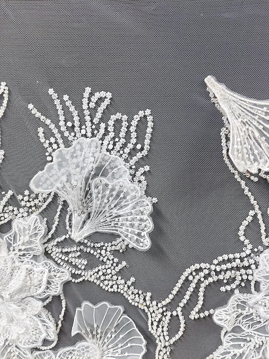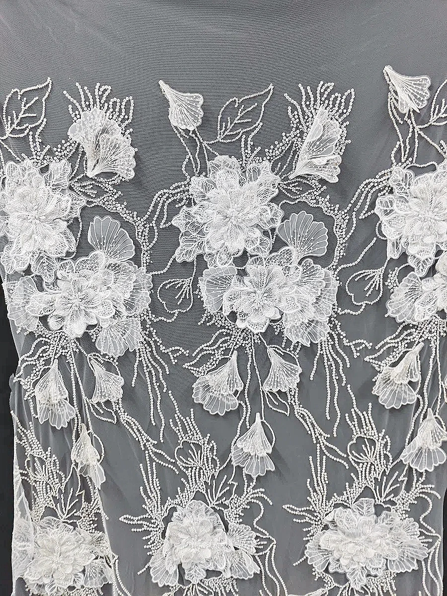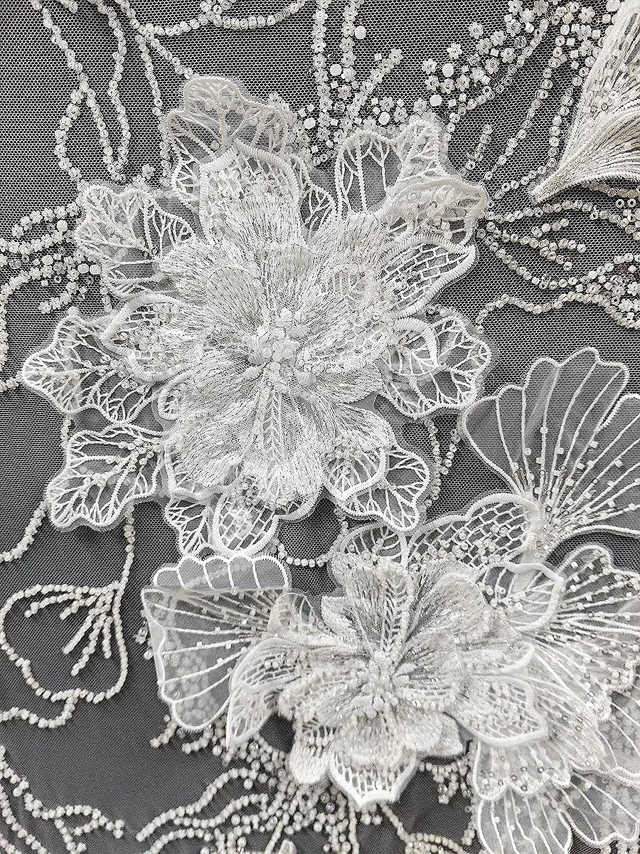 Intrincado bordado floral en 3D con encaje de hilo y delicadas cuentas.