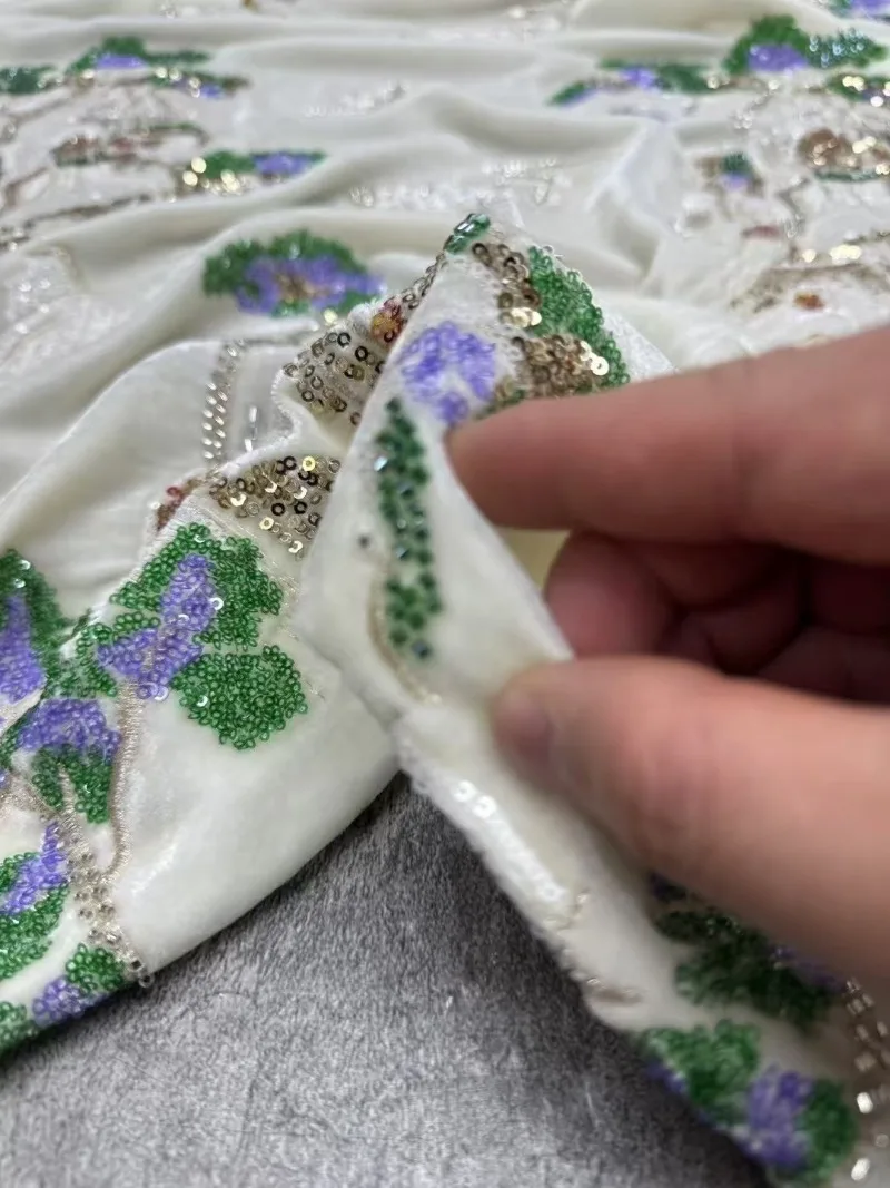 Lujosa tela de terciopelo de seda con intrincados bordados de lentejuelas y tubos de cuentas.