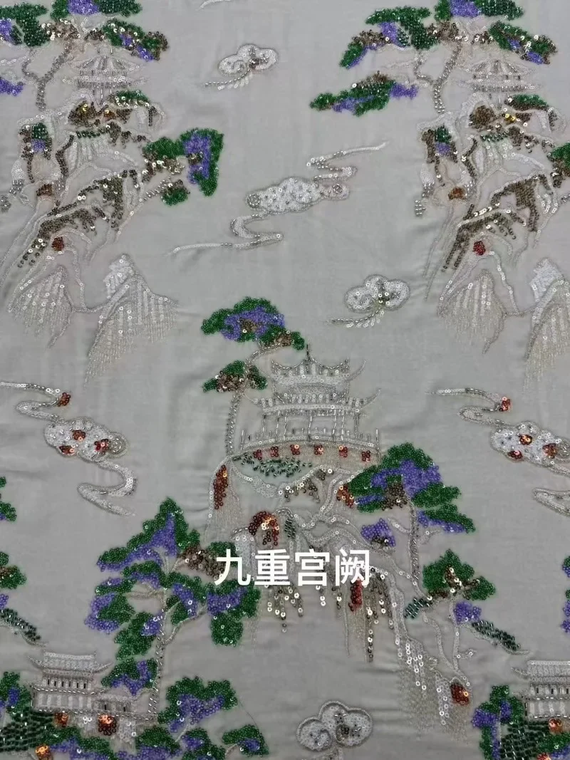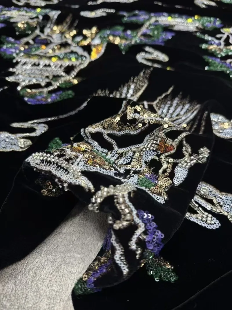 Exquisita tela de terciopelo de seda con bordado de lentejuelas y tubo de cuentas para chaqueta qipao Hanfu, tela de diseño para el Palacio de Jiuzhong.