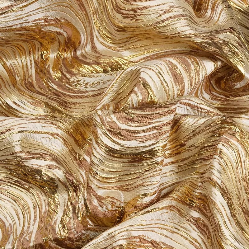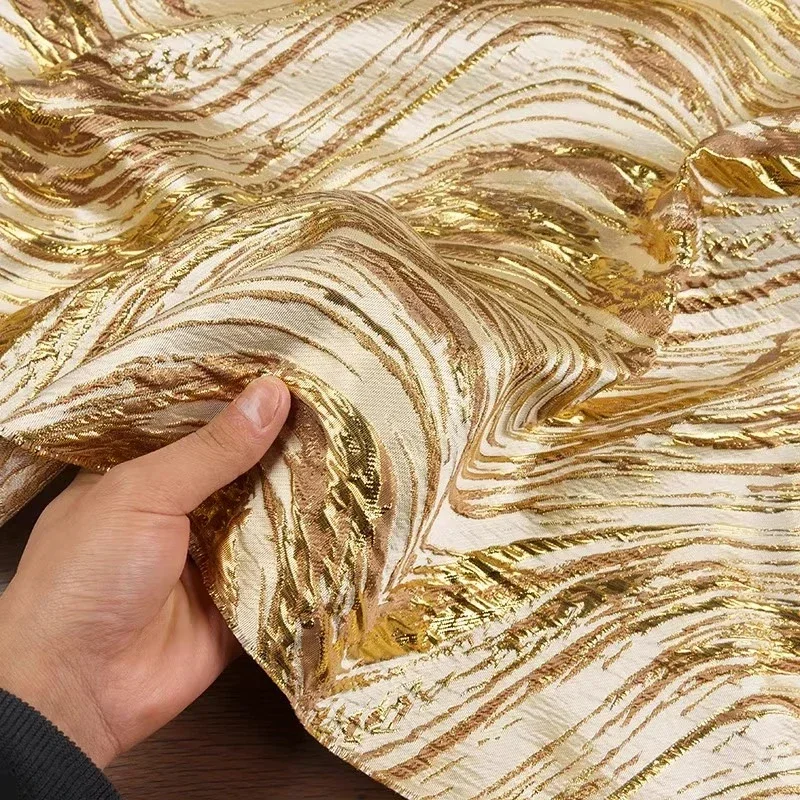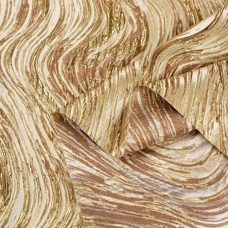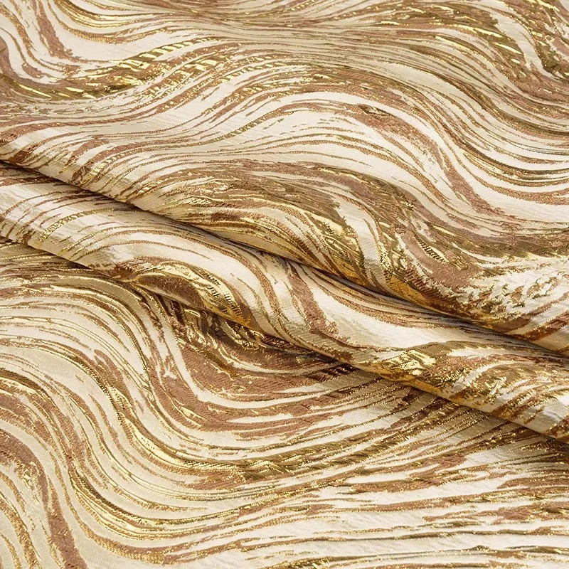 Tejido jacquard satinado con ondas doradas y textura pesada, estilo chino.