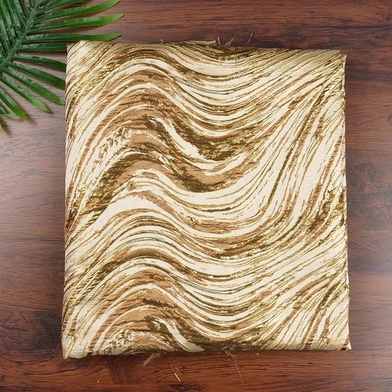 Tejido jacquard satinado con ondas doradas y textura pesada, estilo chino.