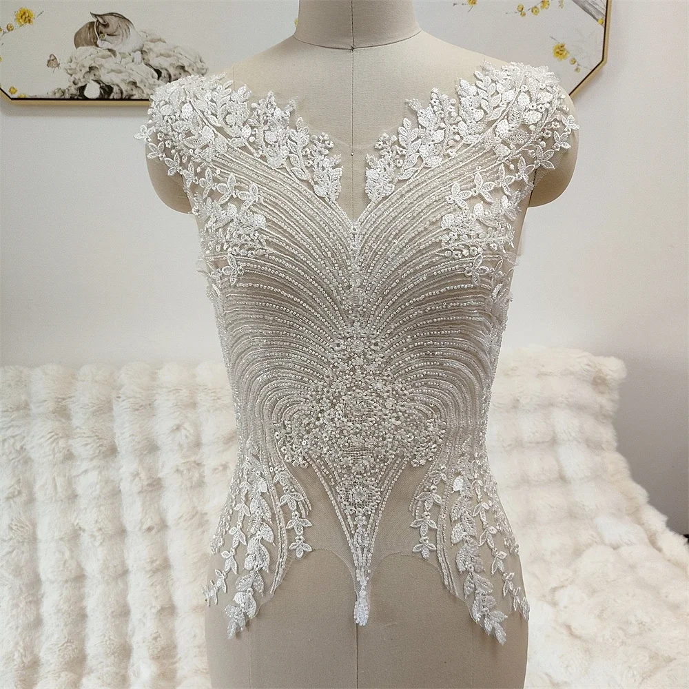 Tela de encaje con borde de flores y cuentas bordadas para vestido de novia, vestido de noche, cheongsam, ropa ahuecada, bricolaje, decoración de pecho hecha a mano