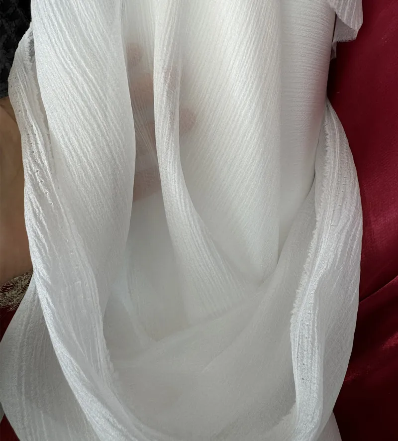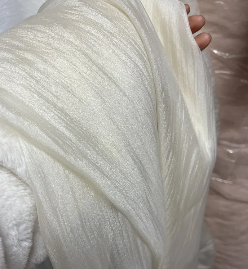 Hilo arrugado blanco champán albaricoque claro, tela fina semitransparente para hacer faldas de vestidos de novia.