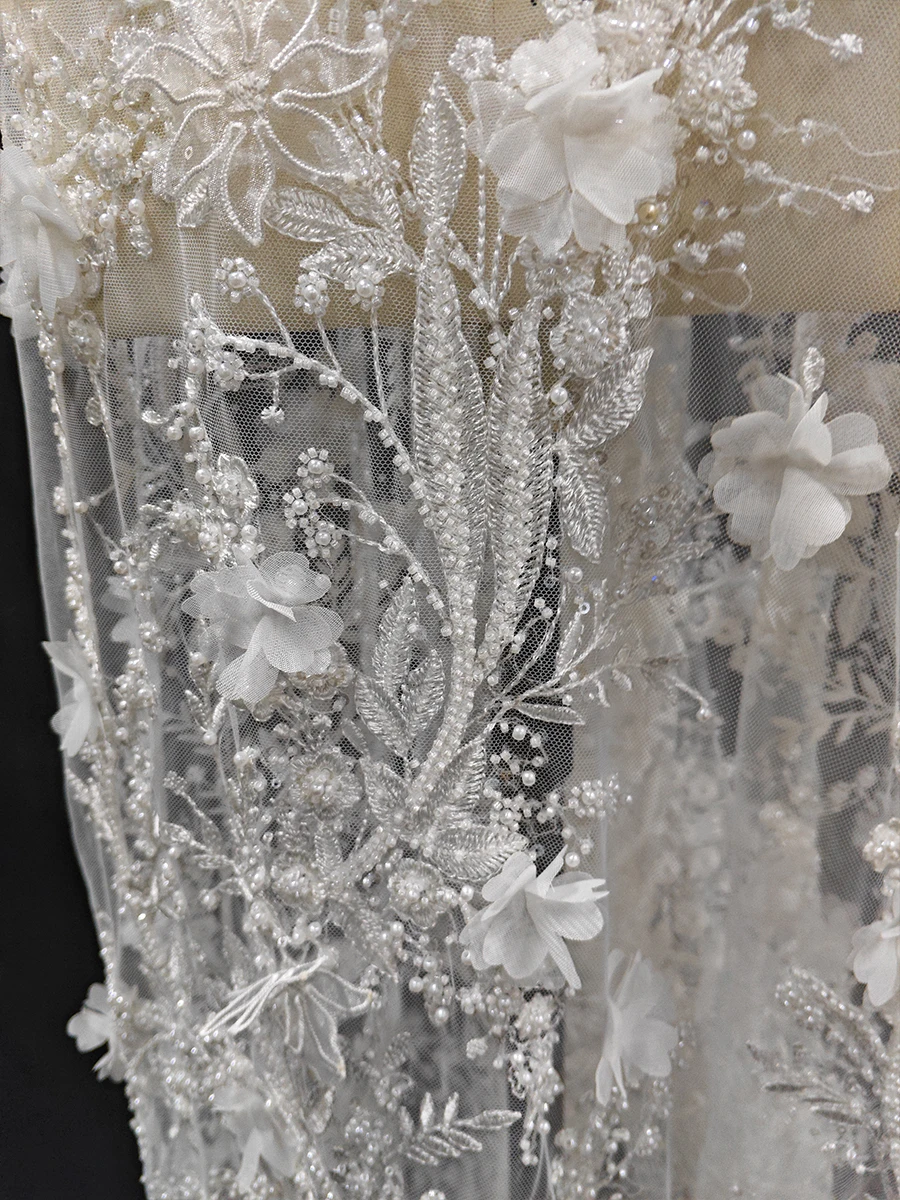 2. Presenta un elegante bordado con motivos de perlas, cuentas y hojas para una apariencia lujosa.