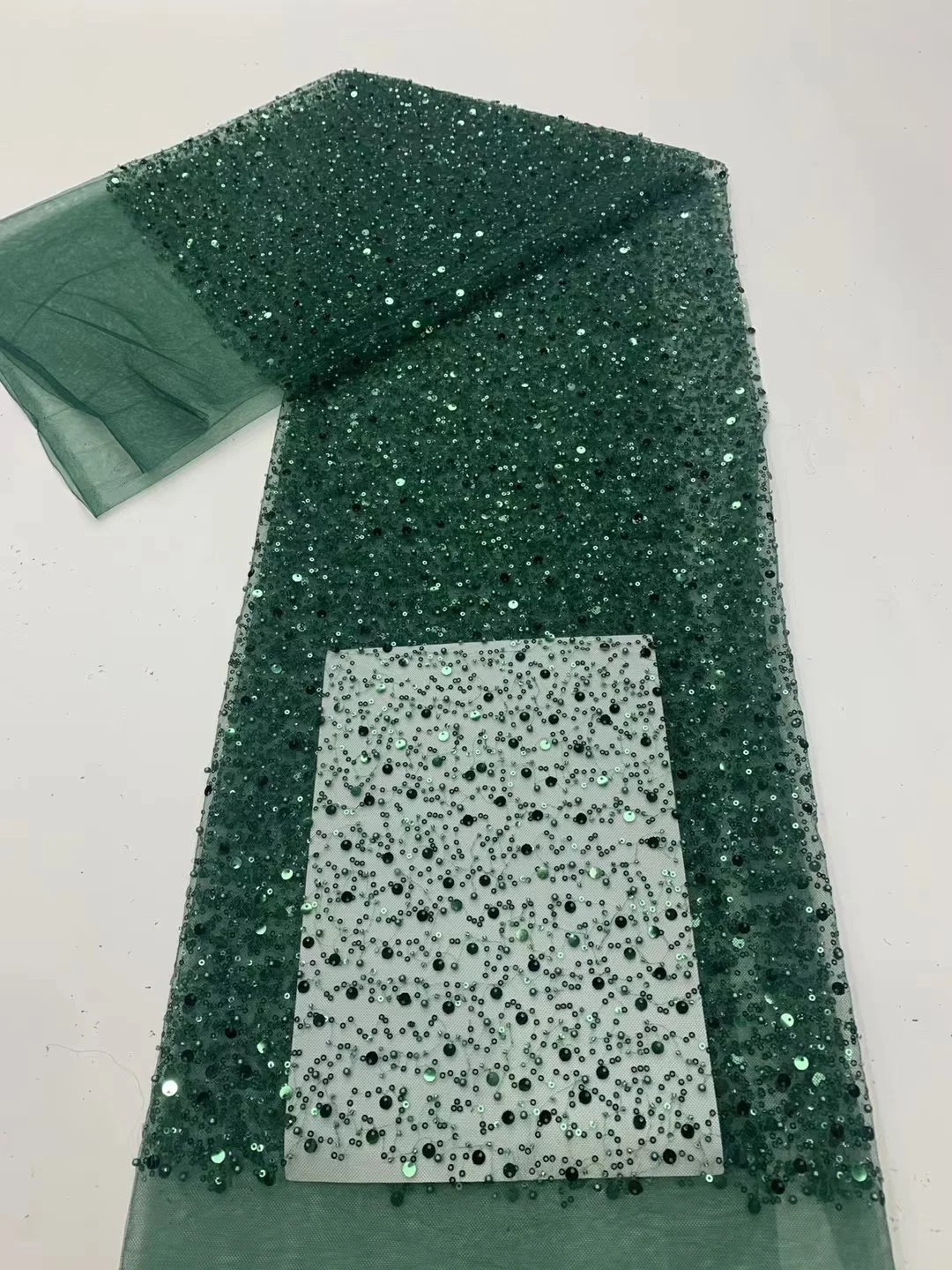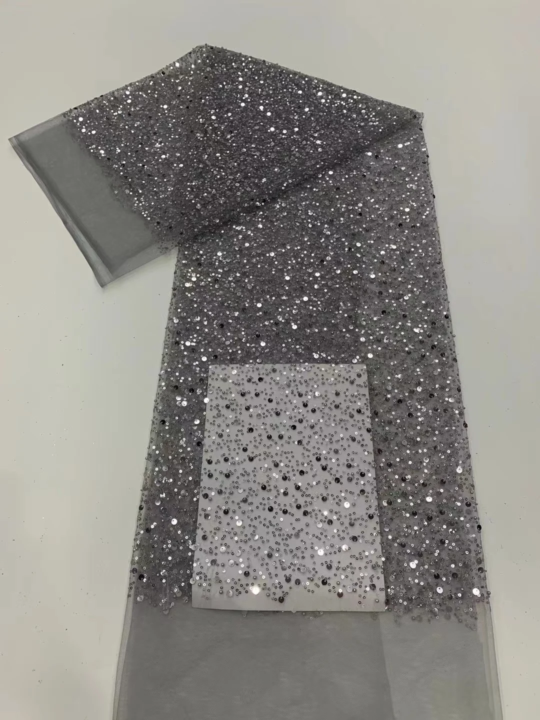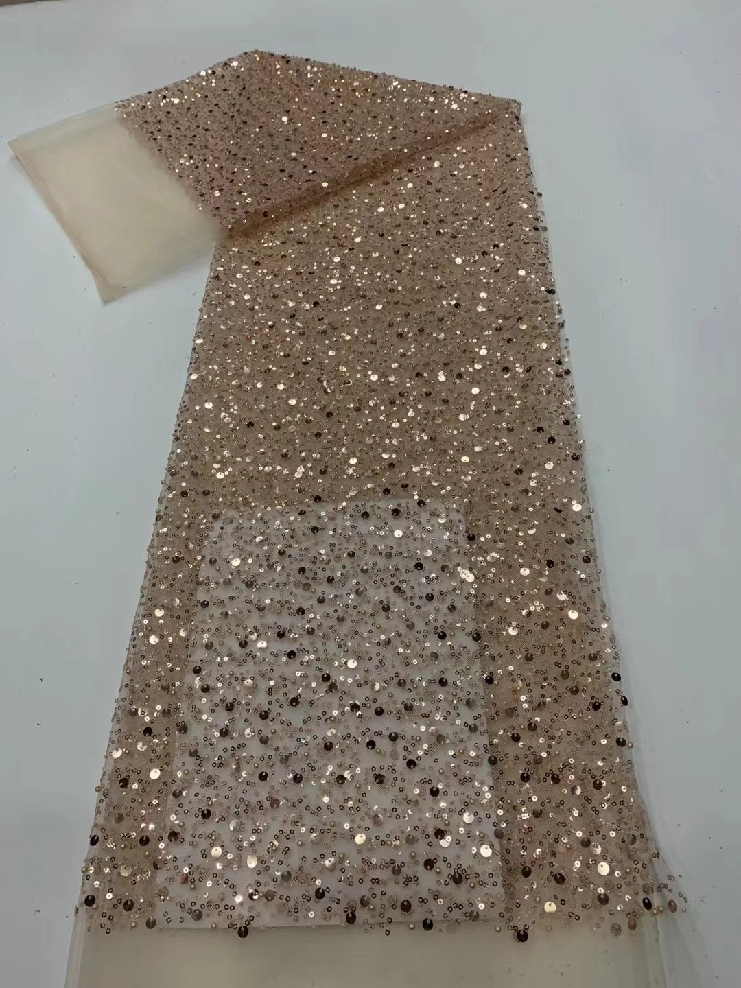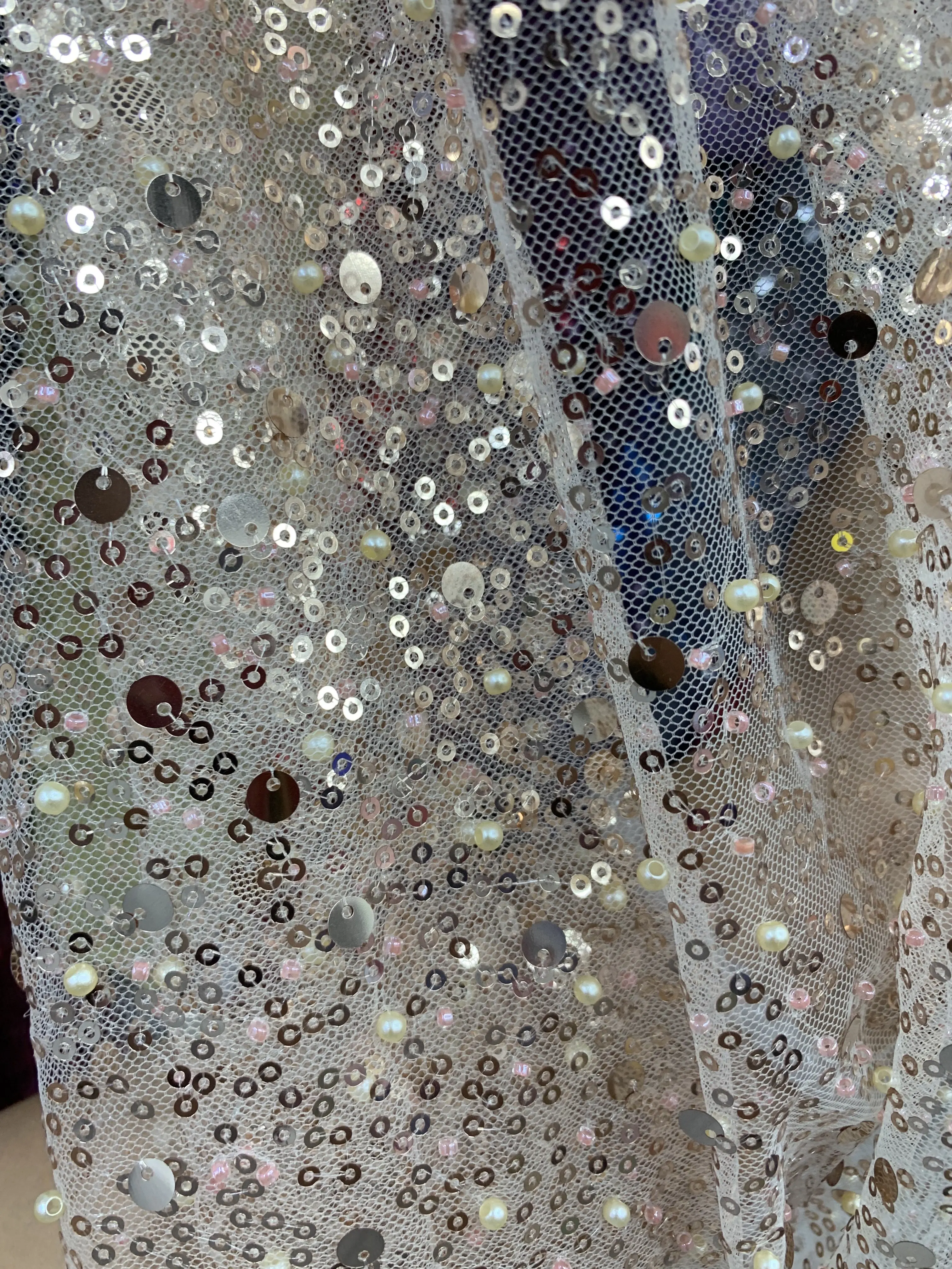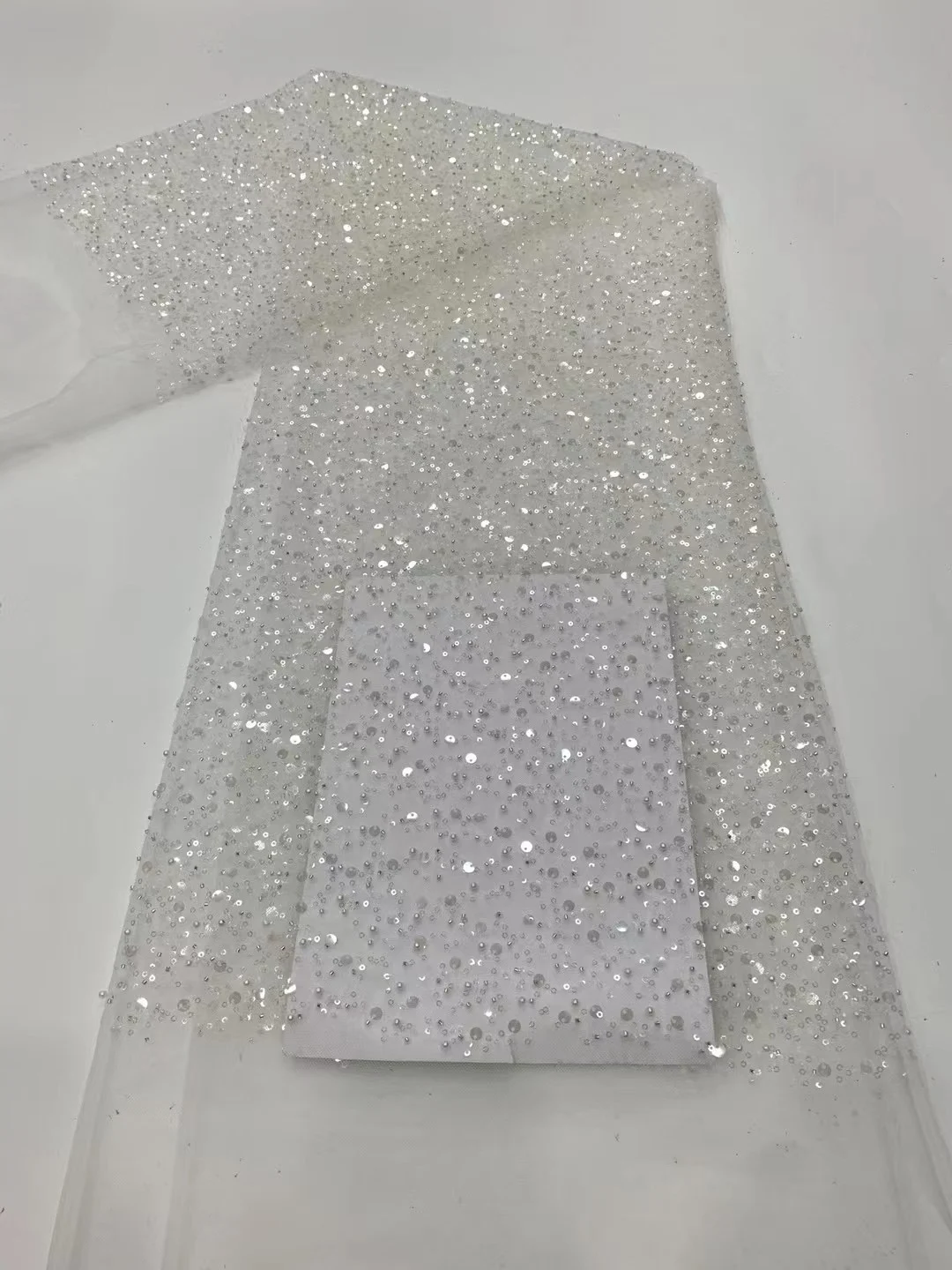 Tela de malla con bordado de perlas y lentejuelas dispersas, adorno de perlas, hecha a mano, para vestido de novia, velo y falda.