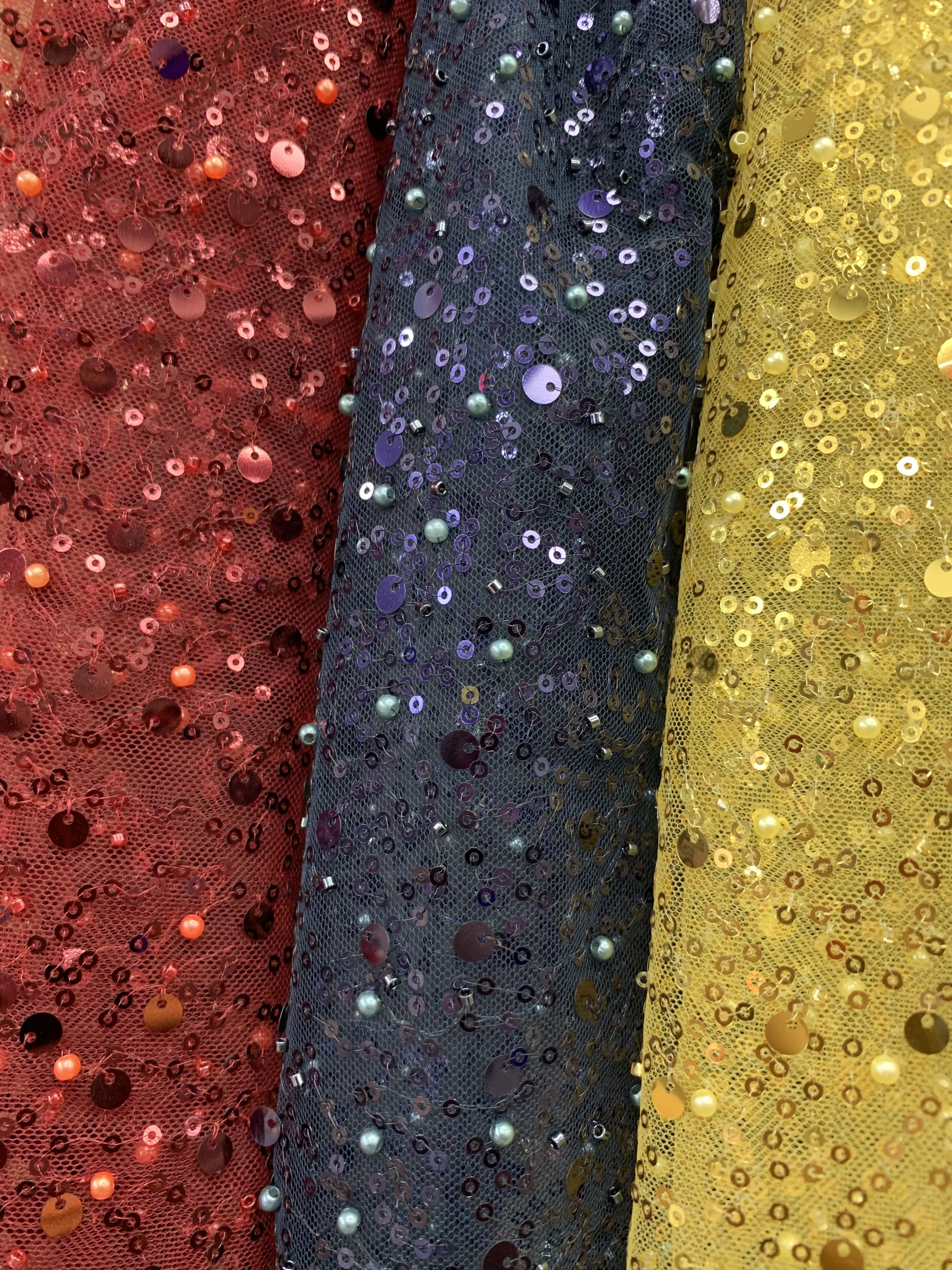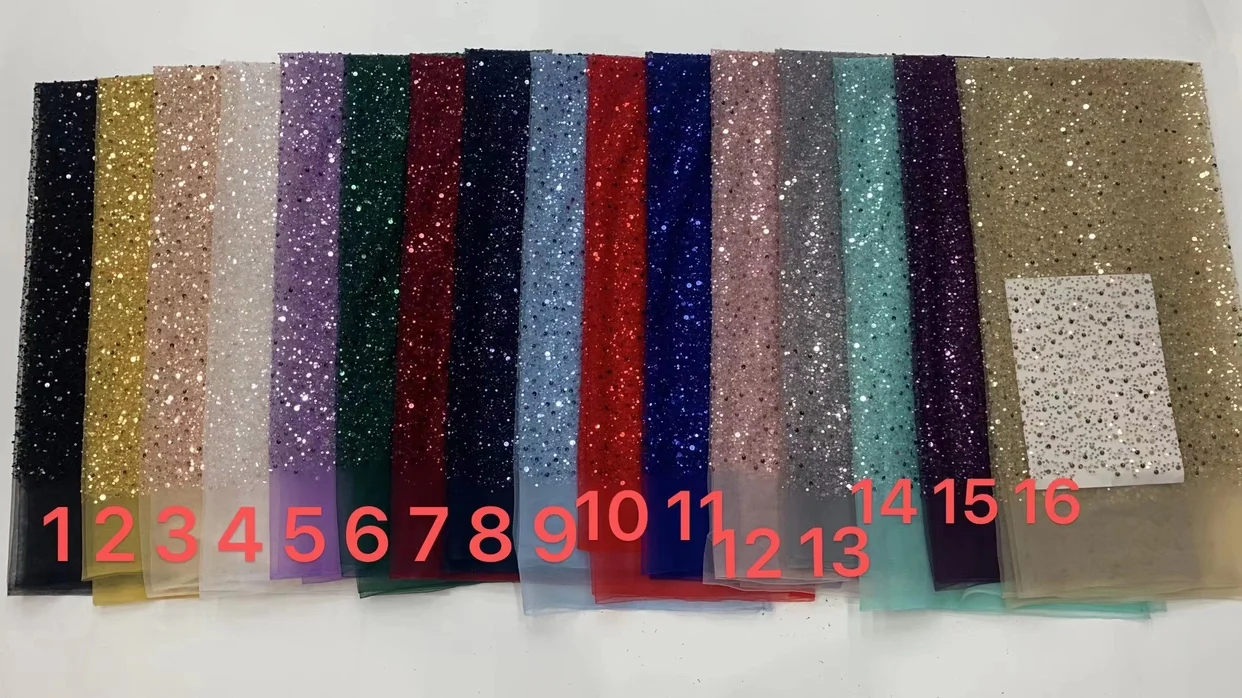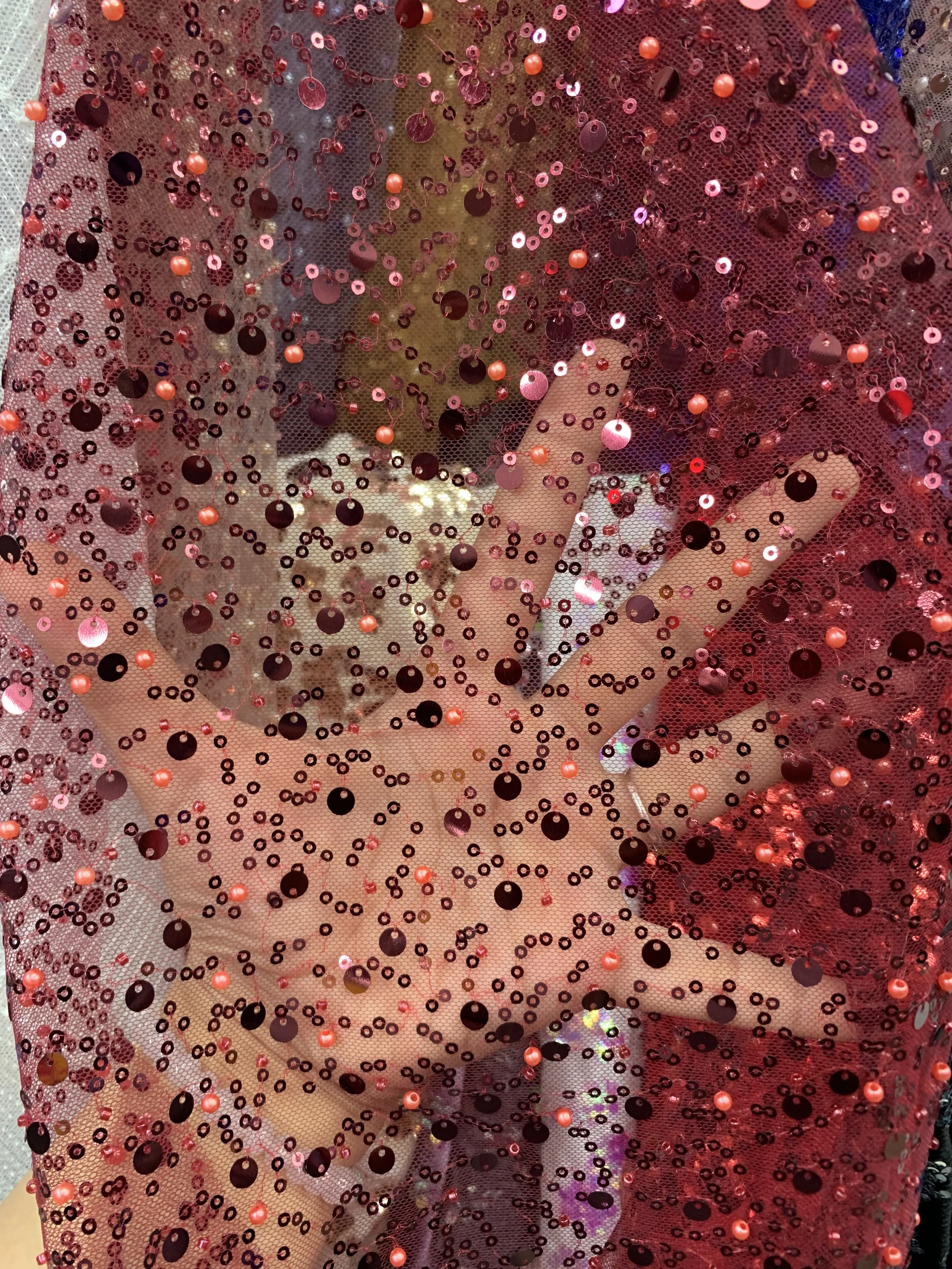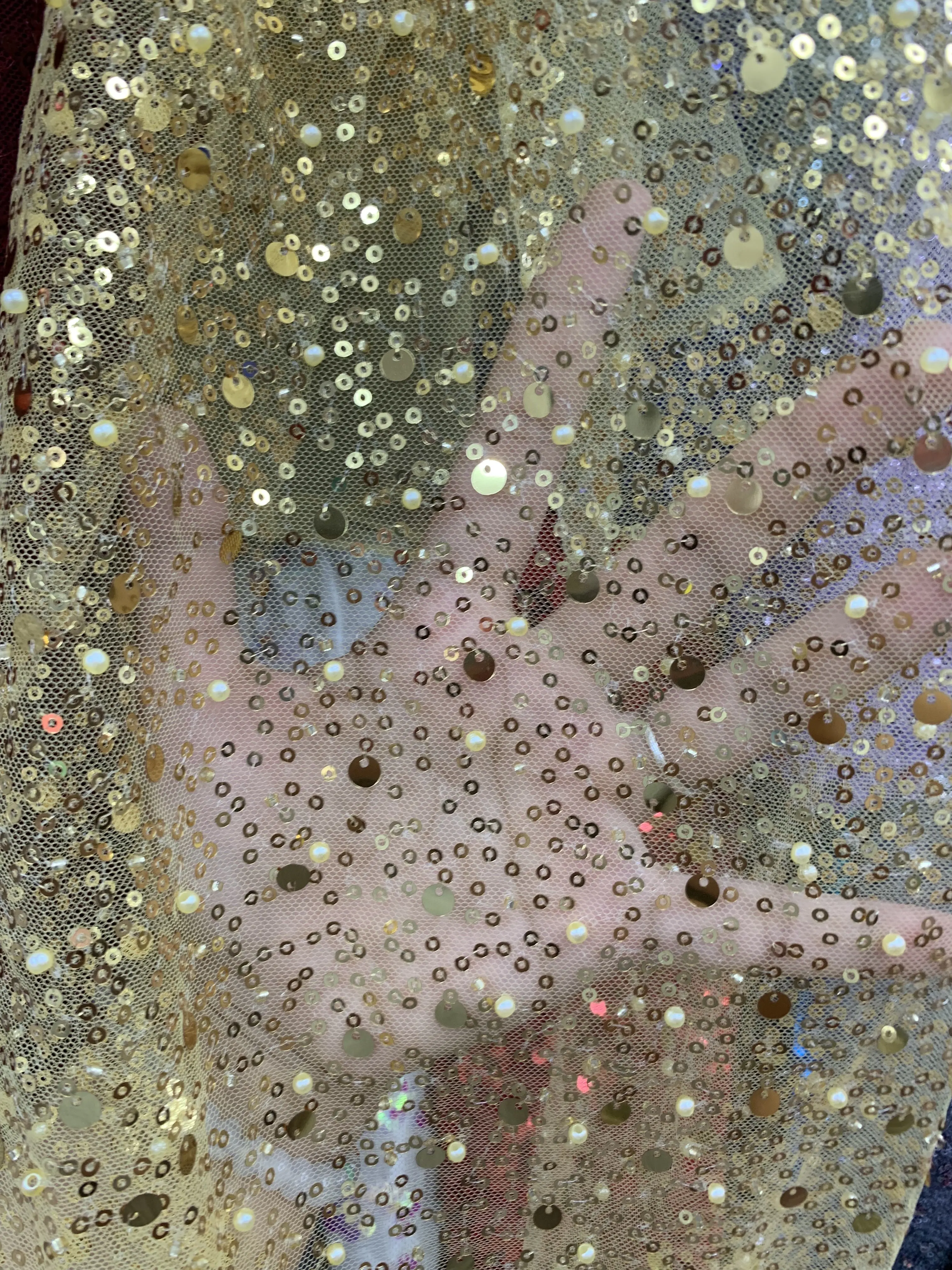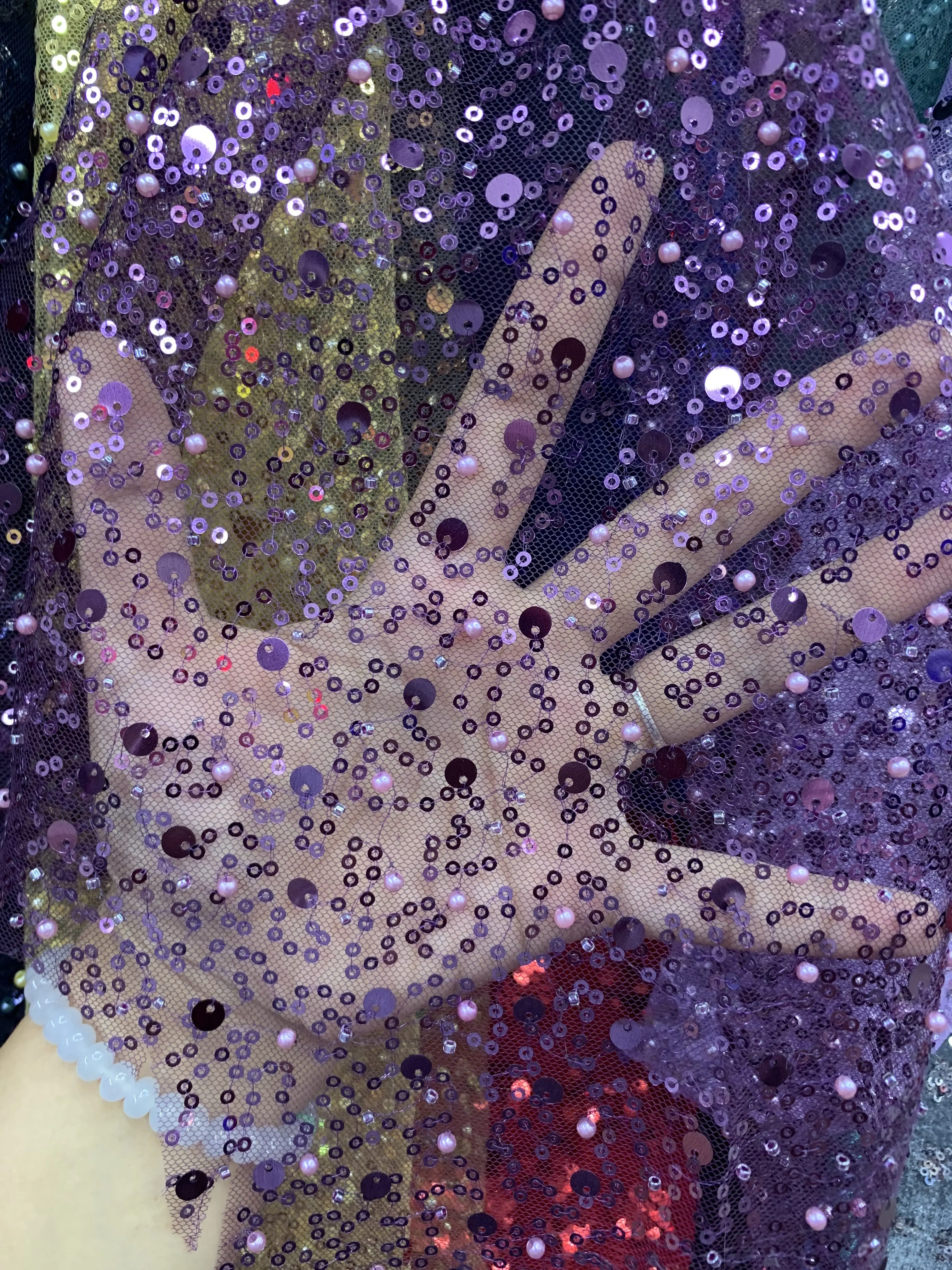 Tela de malla con bordado de perlas y lentejuelas dispersas, adorno de perlas, hecha a mano, para vestido de novia, velo y falda.