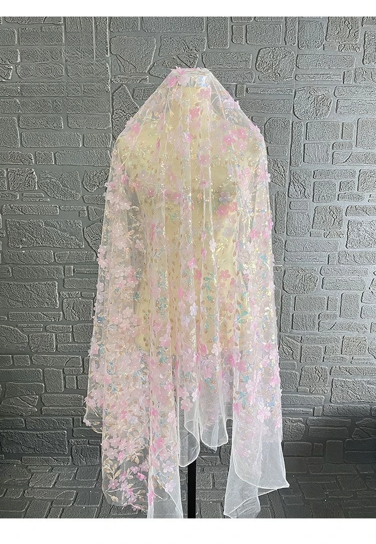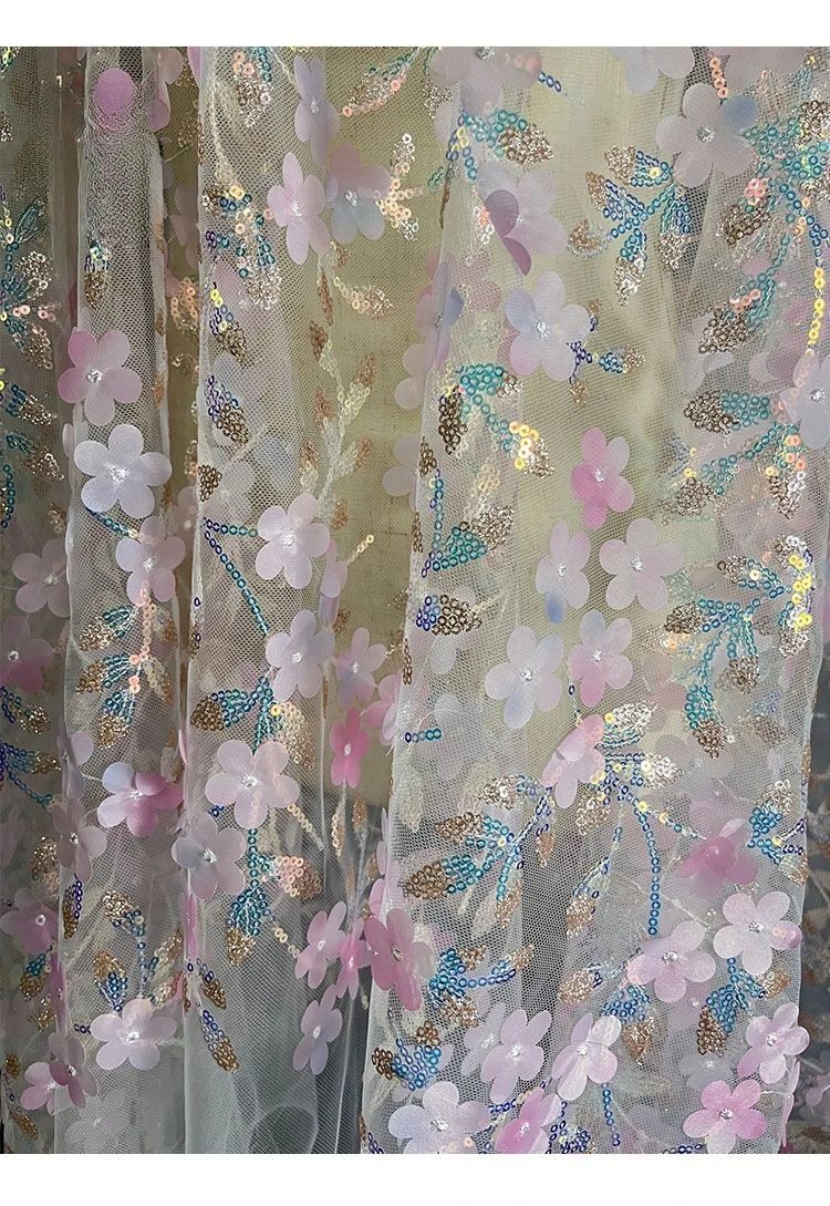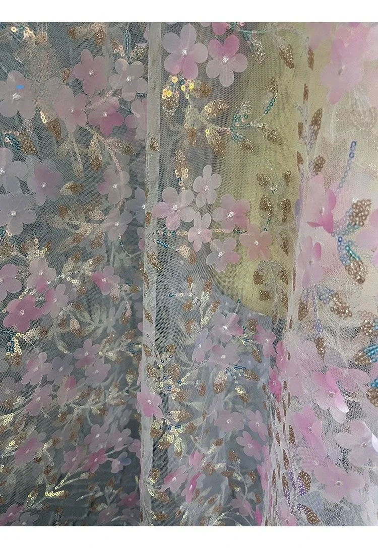 Pink 3D Flower Embroidered Net Fabric With Sequins For Wedding Dress Cheongsam Gown Handmade Clothing Lace Embroidery Material
