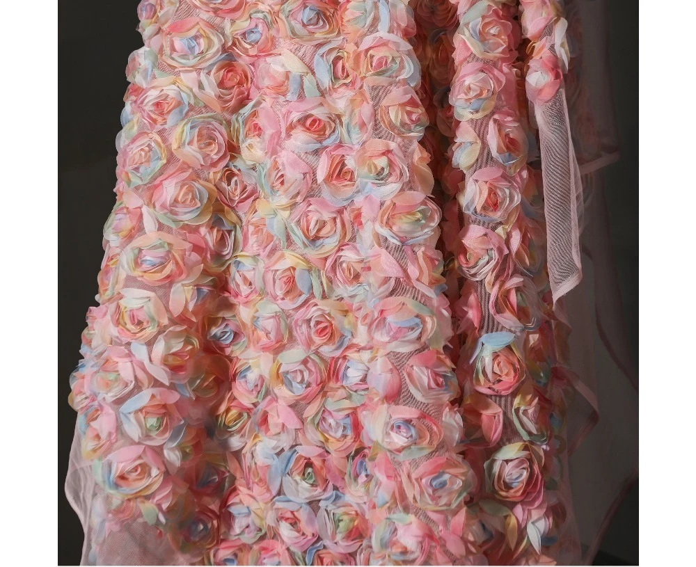 Tela de encaje de malla rosa con flores rosas 3D, semitransparente, bordada para confección creativa, para bodas, moda y manualidades.