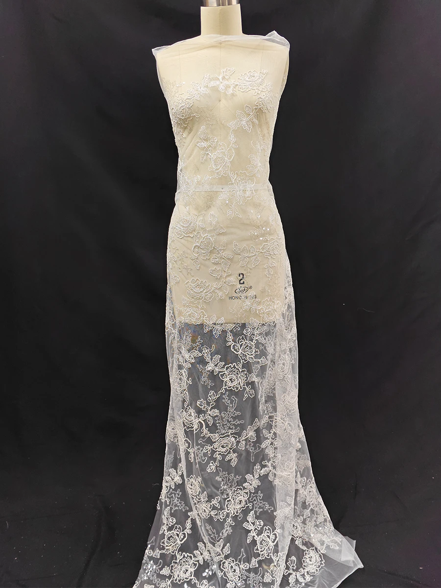 Tela de encaje con bordado de flores blancas crudas, hojas y malla floral bordada, hecha a mano, para decoración de bolsos de boda.