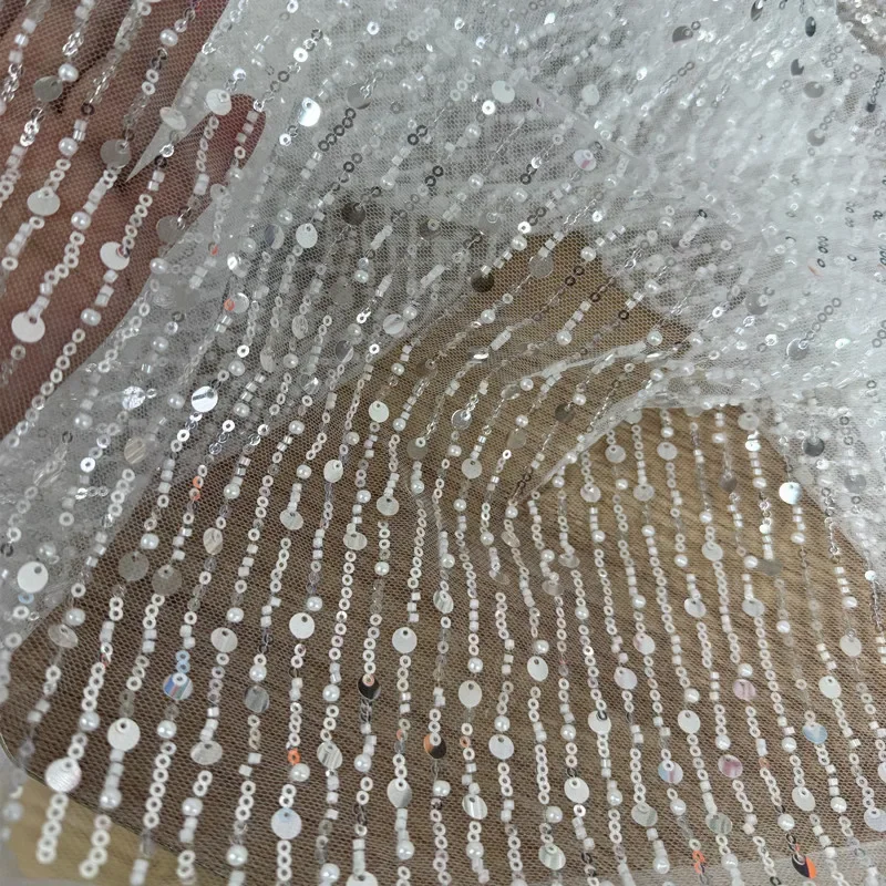 Simple Sequins Pearls Vertical Stripes Lace Embroidery Transparent Mesh Fabric Sewing Wedding Dress Evening Gown Fabric