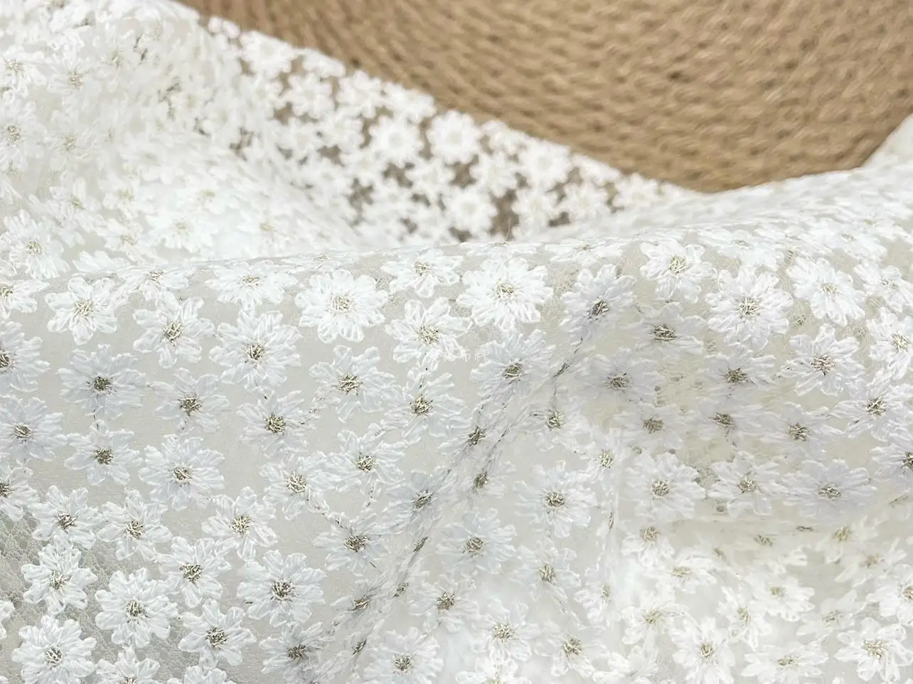 Tela de malla de encaje semitransparente con bordado de rosas blancas y exquisitas estrellas para vestido y falda abullonada