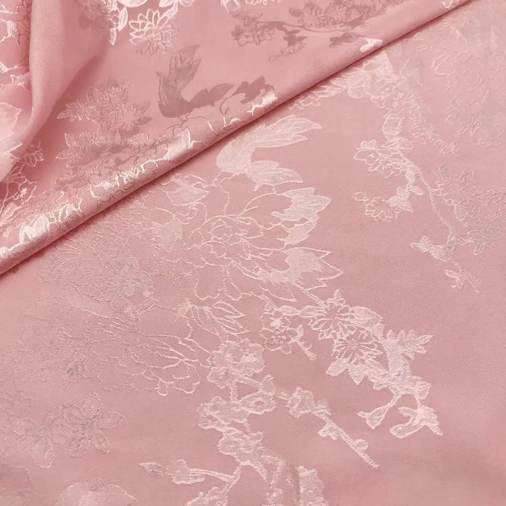 La tela de satén jacquard con flores de vid es suave y adecuada para vestidos de novia, vestidos formales y telas de ropa hechas a mano.