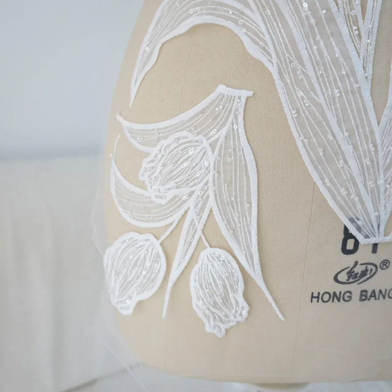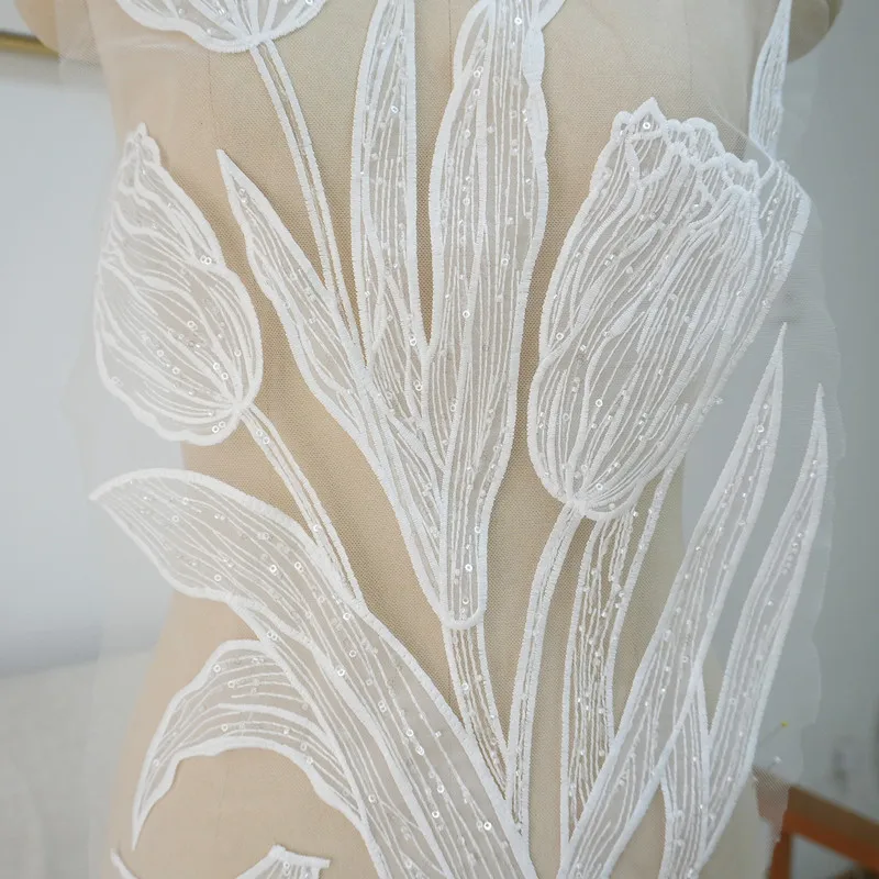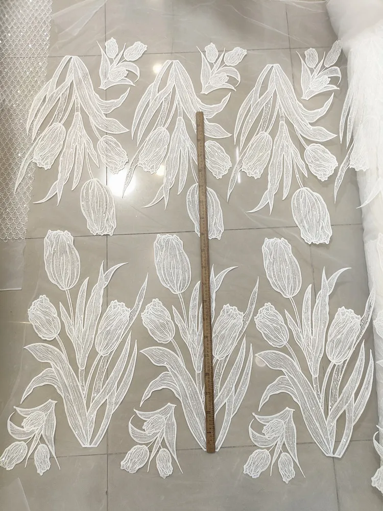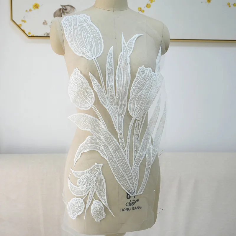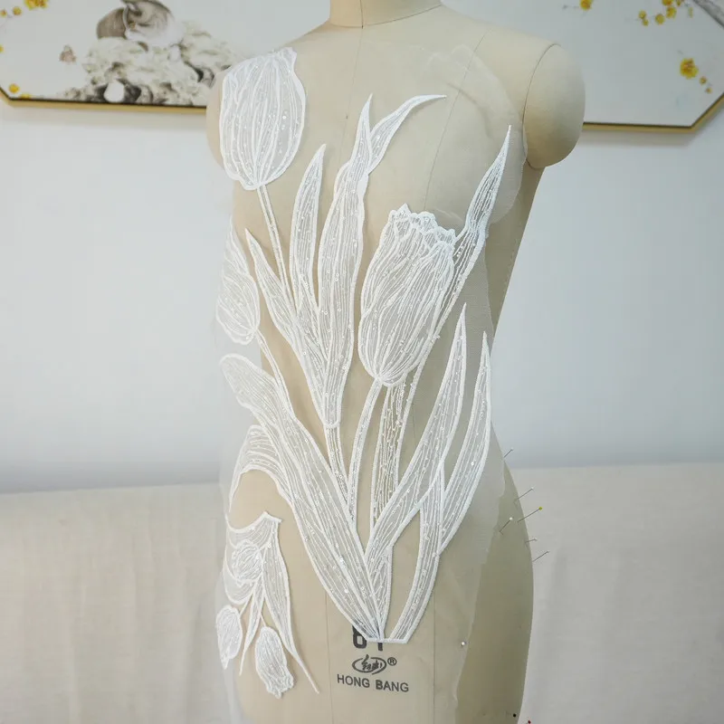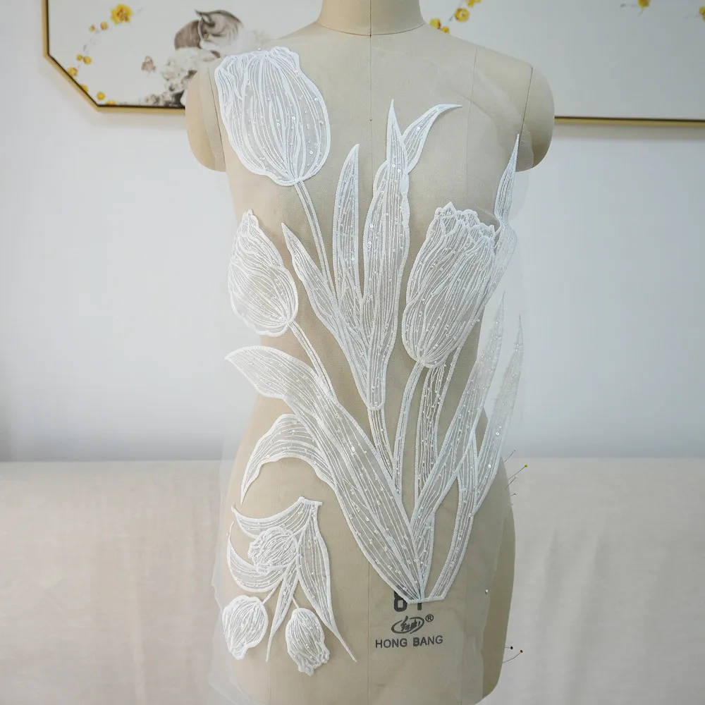 Parche de tela con flores de encaje de alta calidad con cuentas bordadas y purpurina de tulipán Lanfei, ideal para regalo de boda, material para ropa, accesorios de bricolaje