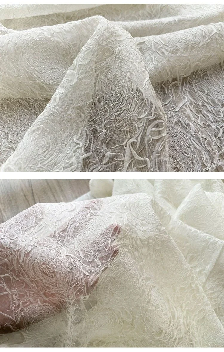 Tela de malla de encaje de gasa crepé con relieve de rosas blancas en 3D para vestido de novia, vestido formal, material de tul de red texturizado transparente.